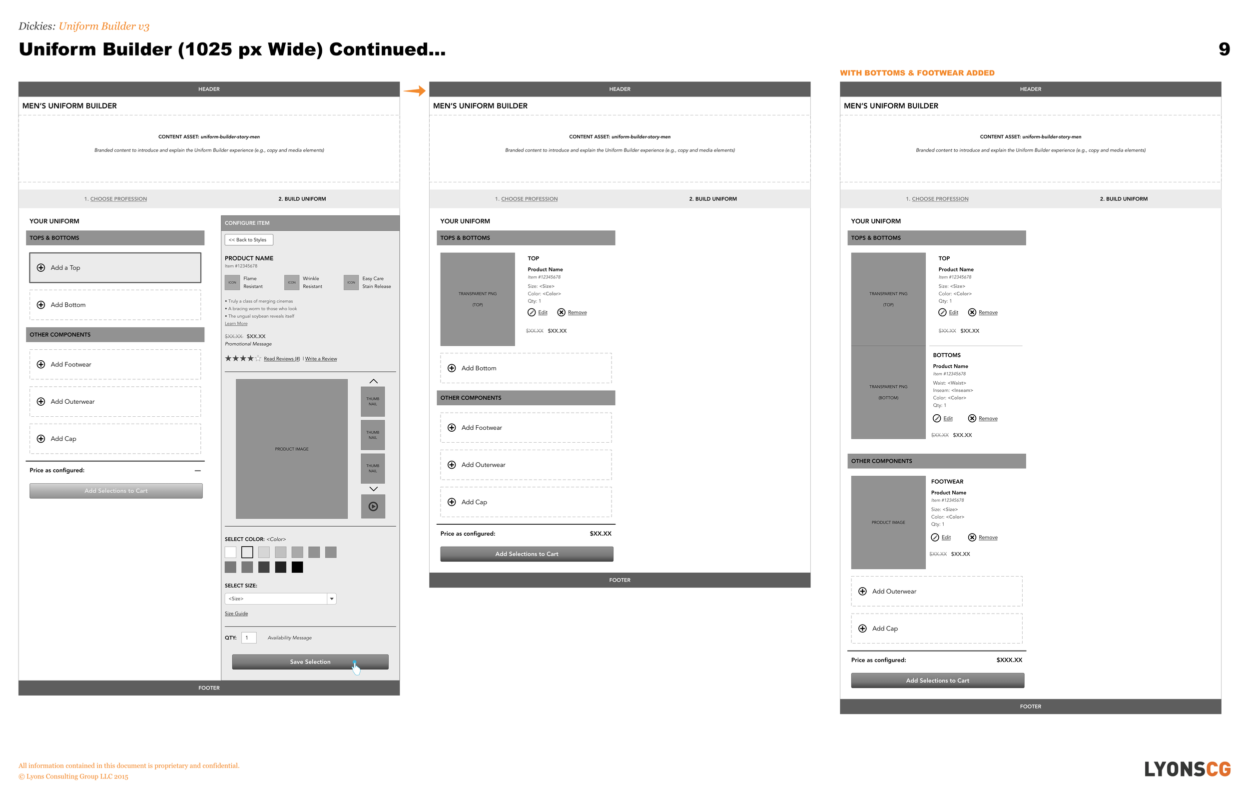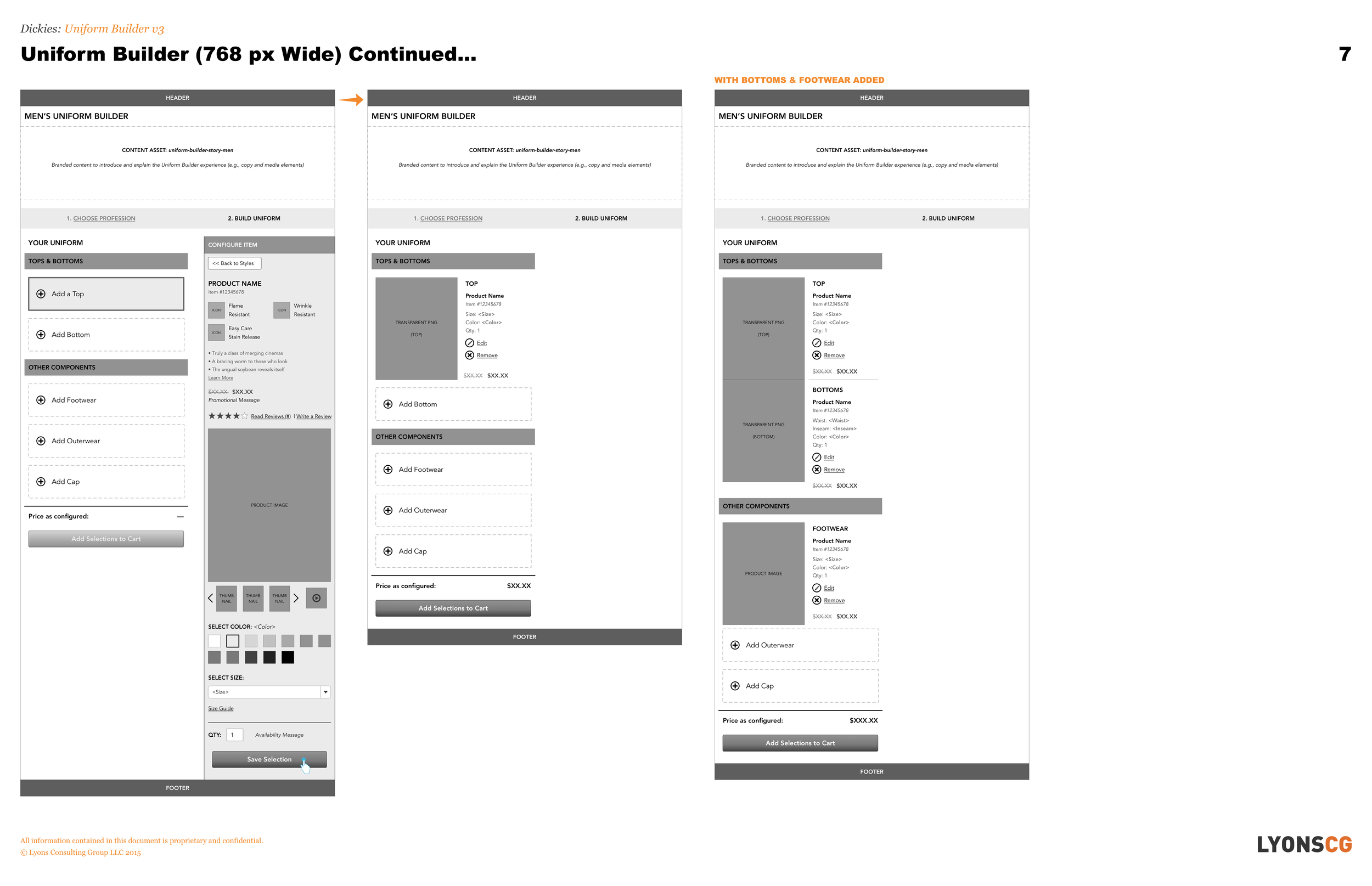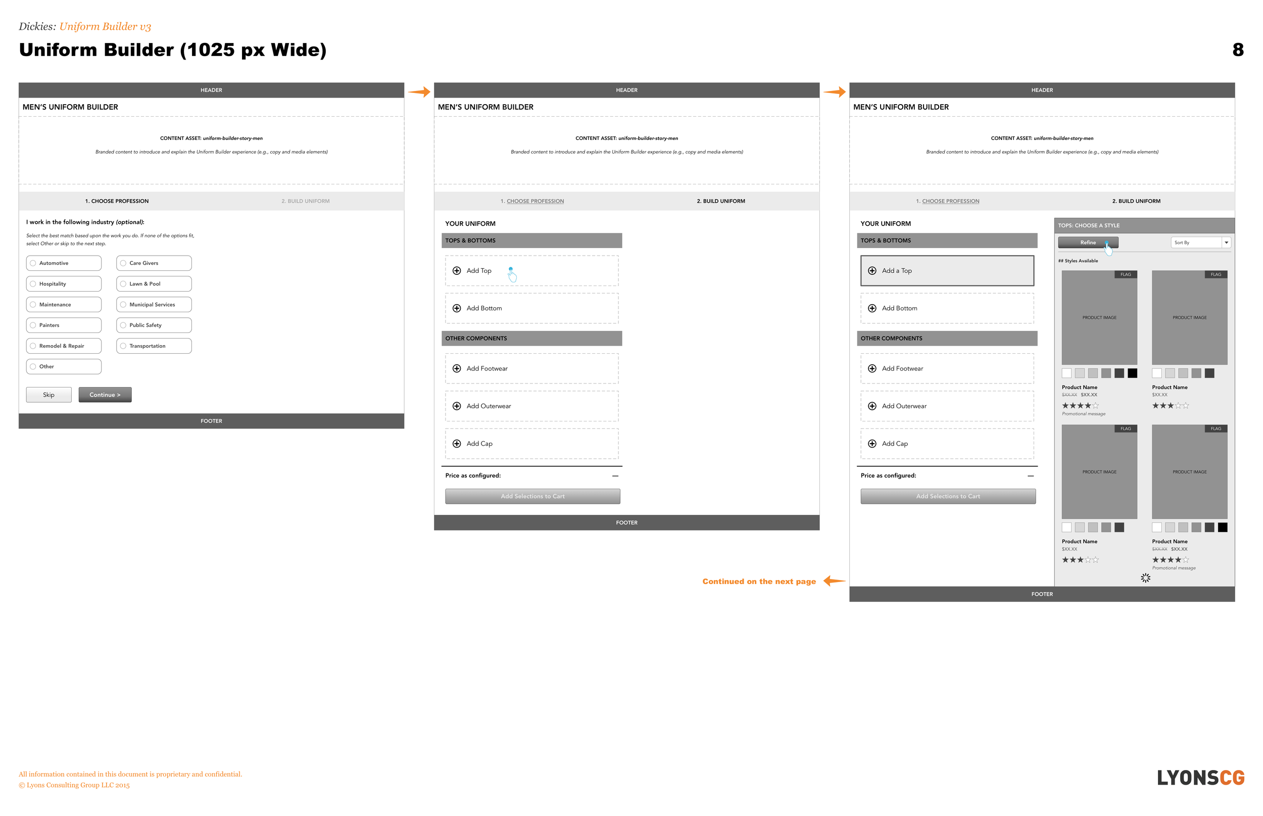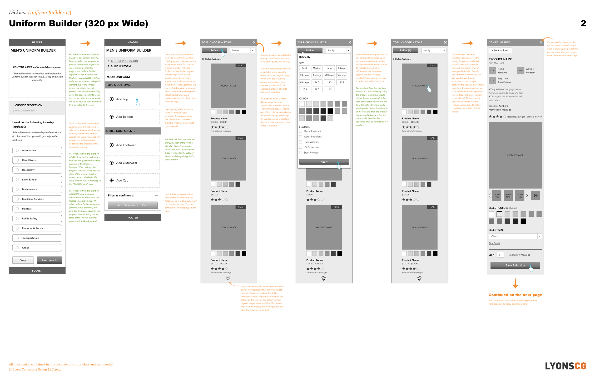 At the start of the redesign effort, I conducted baseline user testing of the existing Uniform Builder experience to assess its strengths and weakness with actual Dickies customers. One of the most interesting discoveries to come from this research was that, due to the large number of uniforms available, men frequently asked for a way to narrow down the options by profession and performance characteristics, such as flame resistance and waterproofing. For women and children, on the other hand, these features were less important due to the smaller number of uniforms available. Since the experience would be driven through the Men, Women, and Kids categories, the merchant needed the flexibility to enable and disable filters such as these from within the administration panel of Demandware. You'll see this decision reflected in notes on page one of the document below.